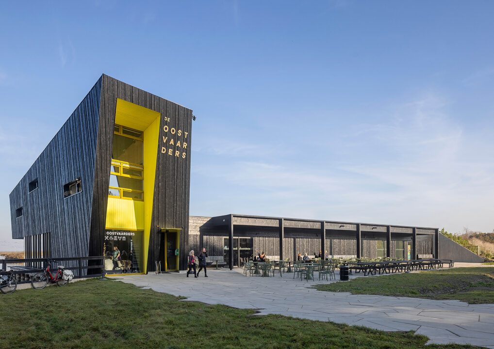 The Nature Experience Center stands at the edge of the Oostvaardersplassen in Almere, one of Europe’s most unique and internationally renowned nature reserves. Positioned where four distinct landscapes converge—water, forest, reed beds, and polder land—the building is a physical landmark and a vital link between the city and its surrounding nature. Since its completion in 2008, the original building serves as a hub for nature education and observation. With the designation of the Oostvaardersplassen as part of Nieuw Land National Park, interest in the site grew rapidly, attracting a diverse range of visitors: nature enthusiasts, hikers, cyclists, school groups, and international tourists alike. To accommodate the growing number of visitors, it has been decided to expand, renovate and redesign the center. The original building was conceived as a beacon: a compact vertical volume highlighted by bright yellow accents, underlining its role as a gateway to the Oostvaardersplassen. The expansion respectfully continuing the same architectural language and material palette—black-stained timber façades with vertical detailing—while introducing a strong horizontal gesture.
